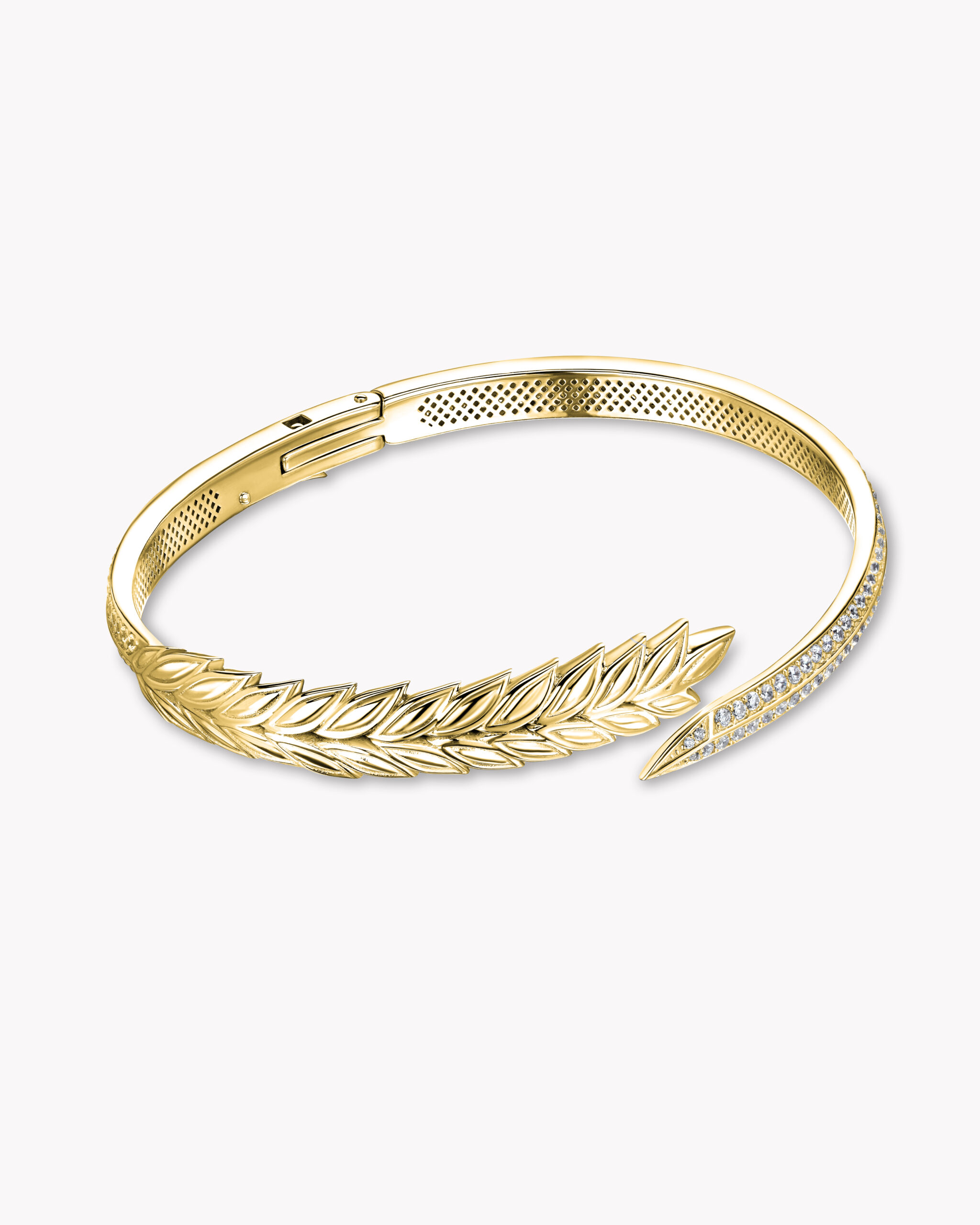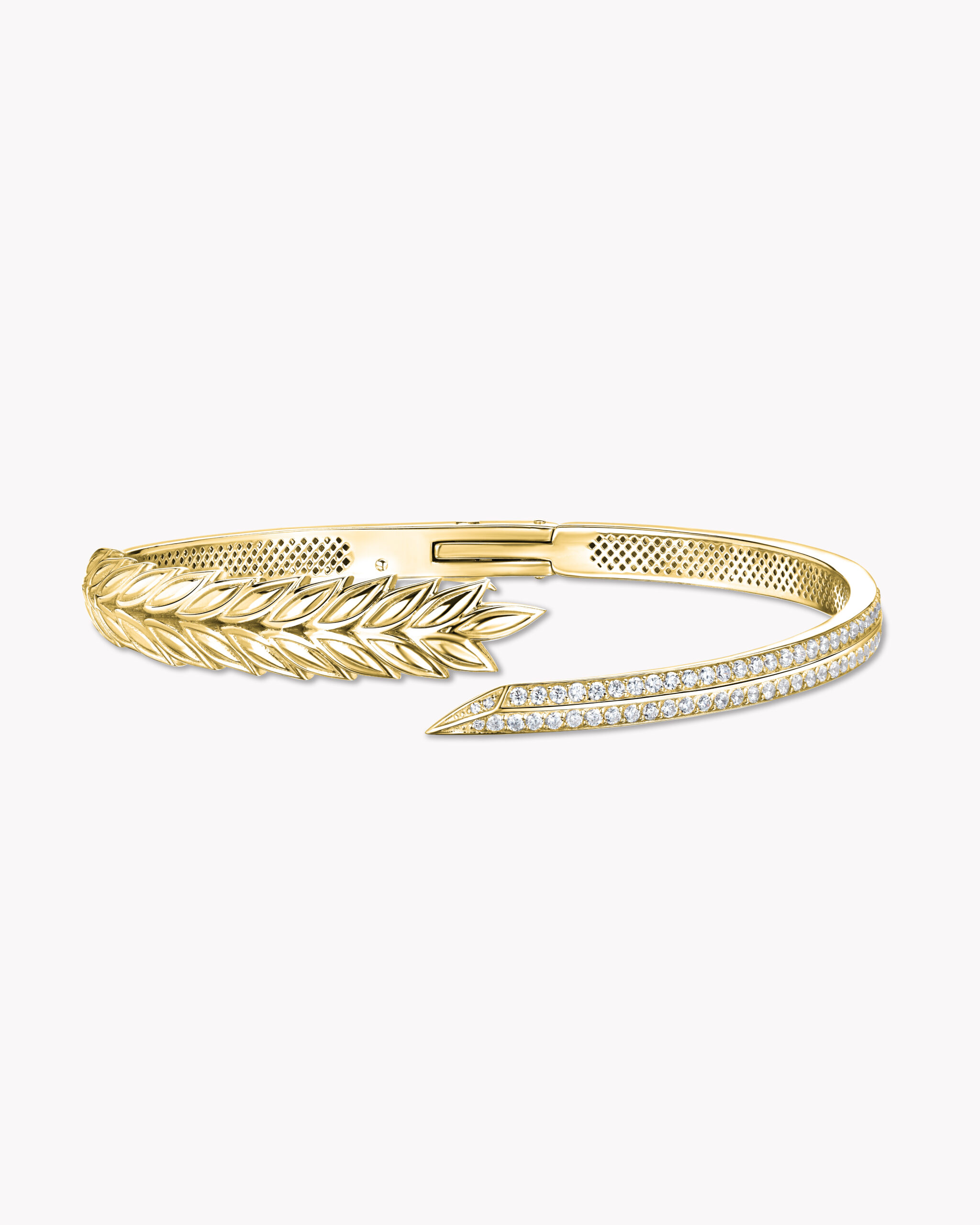 Нежная позолота, нанесенная на серебро 925 пробы, наполняет украшение теплым сиянием, в котором отражаются 144 фианита круглой бриллиантовой огранки (общий вес — 4,26 карата). Камни словно вплетены в структуру браслета в попытке оттенить уникальную красоту и непредаваемое изящество формы украшения.