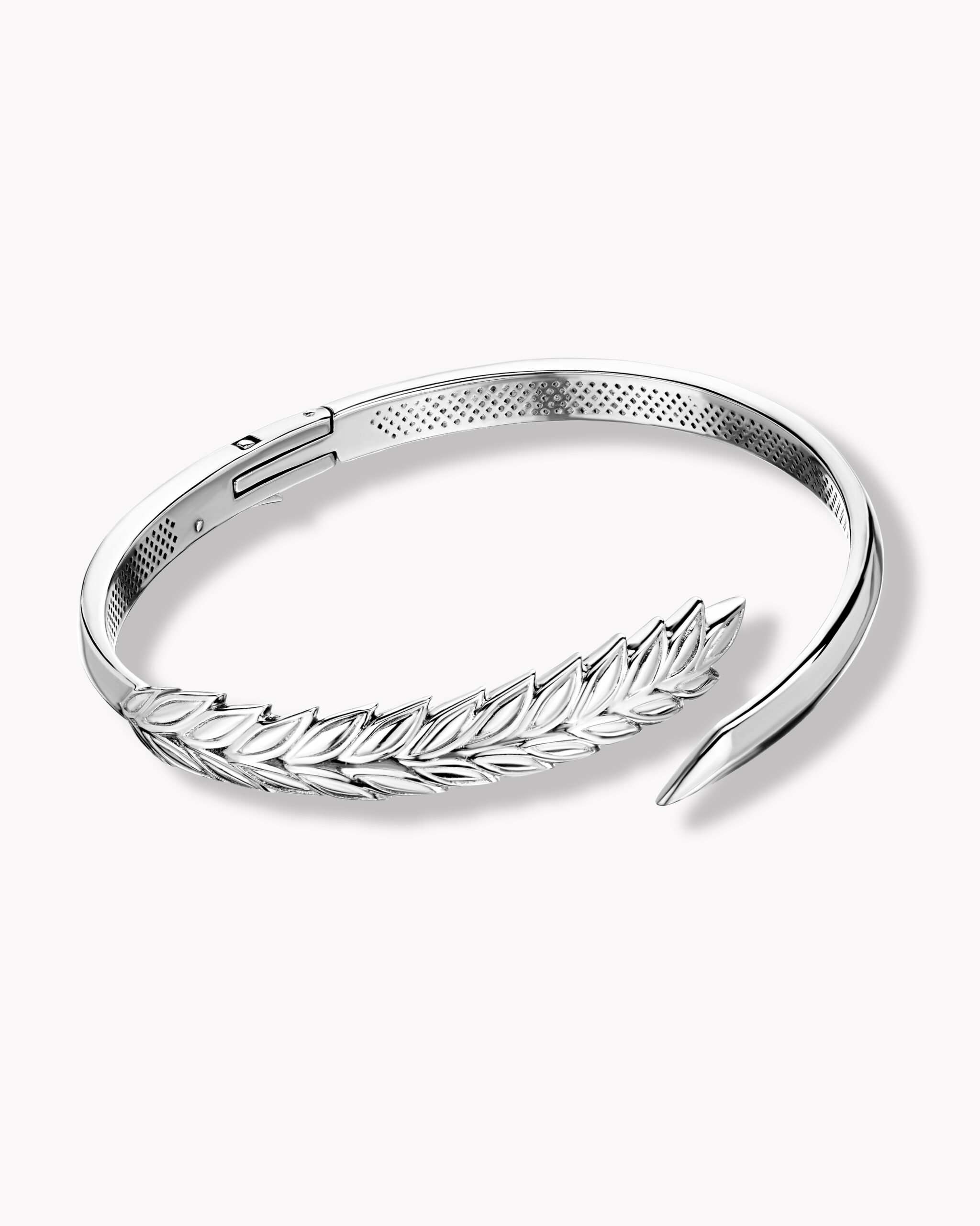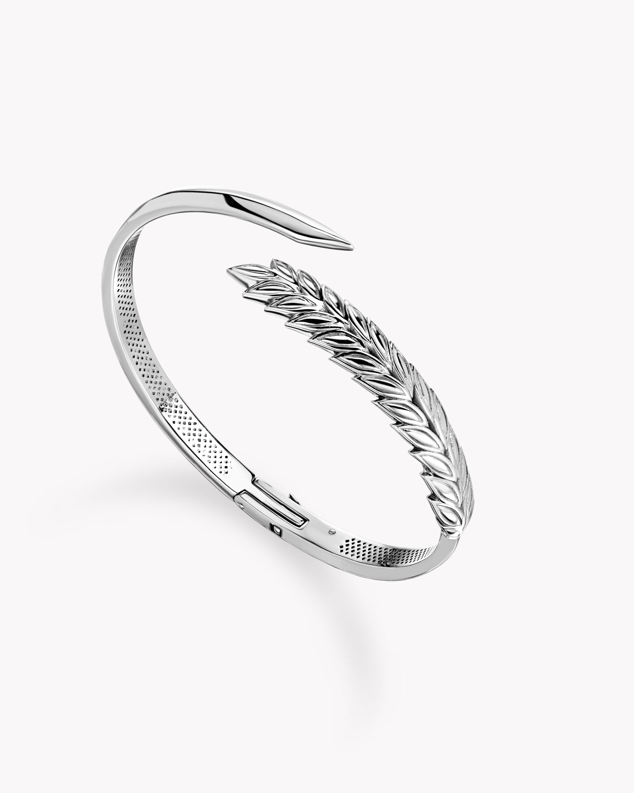 Ода природной гармонии, воплощенная в благородном серебре. Изогнутая форма браслета повторяет изящный силуэт пшеничного колоса — древнего символа женской силы, изобилия и внутреннего умиротворения.