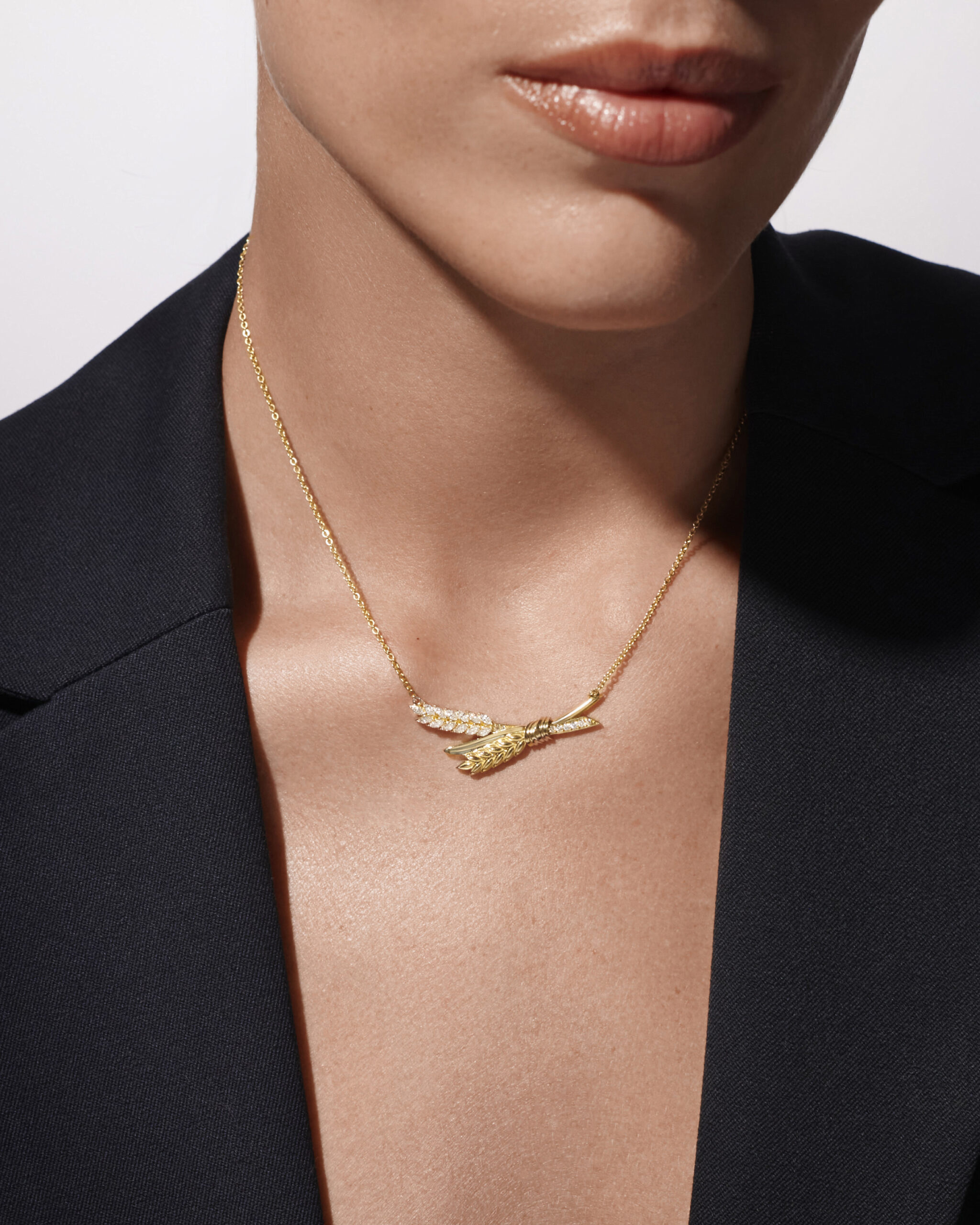 Колье “Колос” — для тех, кто понимает язык истинной роскоши и ценит глубинный смысл прекрасного. Каждый камень ювелирной композиции — как зерно будущих свершений, заключенное в оправу из благородного желтого золота. Вытянутая форма лабораторно выращенных бриллиантов огранки маркиз повторяет природные очертания созревшего злака, а круглые бриллианты весом 0,317 карата дополняют композицию словно капли утренней росы, навечно застывшие в золотой оправе.