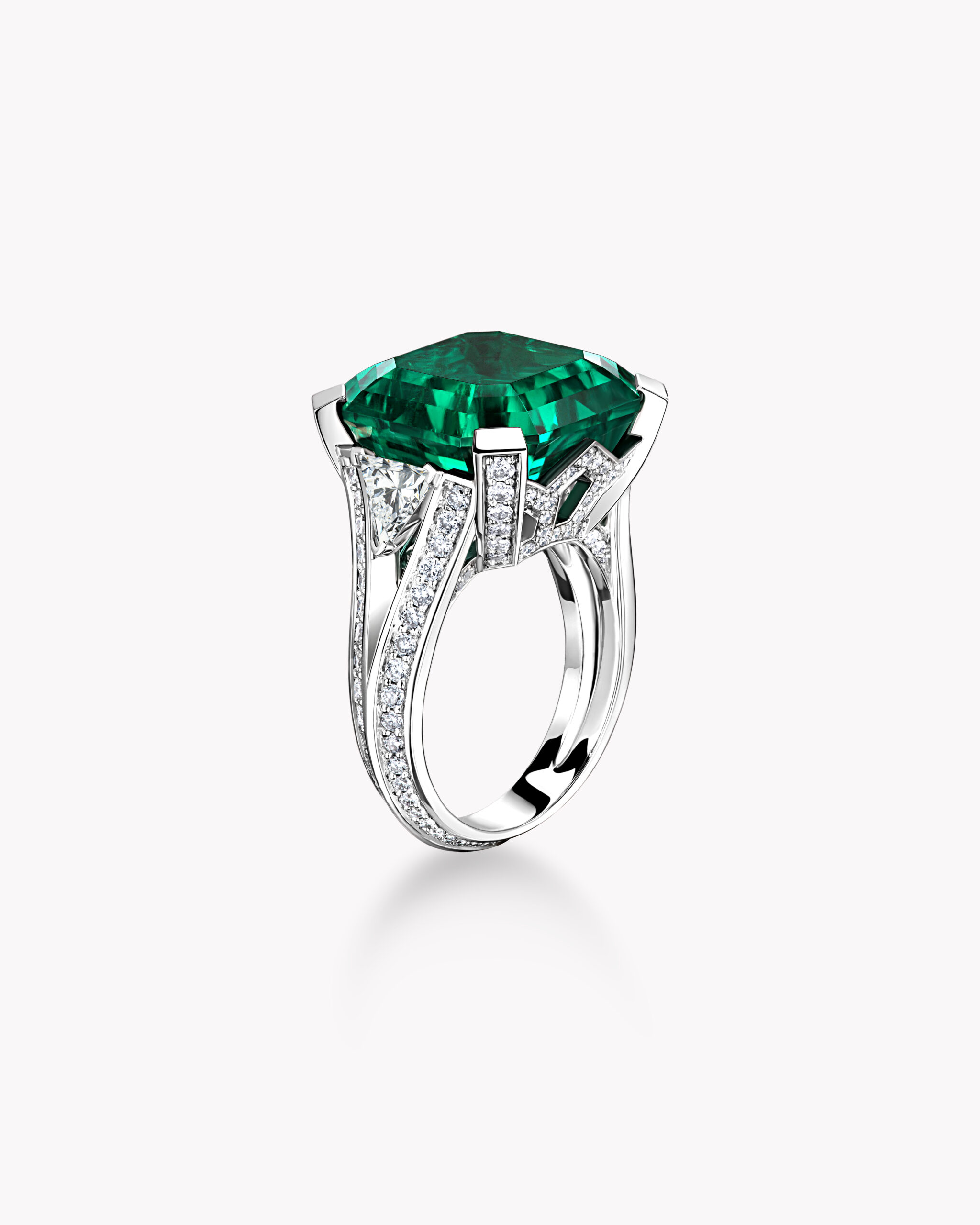 Украшение, в котором каждая грань подчинена идее совершенства. В центре композиции — лабораторно выращенный изумруд насыщенного оттенка: глубокого и живого, словно драгоценная капля природы, заключенная в идеальную форму. Его изумрудный цвет и строгая геометрия огранки ашер создают ощущение благородной силы и редкой гармонии совершенства. Бриллианты огранки трапеция и круг сопровождают солирующий камень, наполняя украшение магическим — неповторимым — звучанием