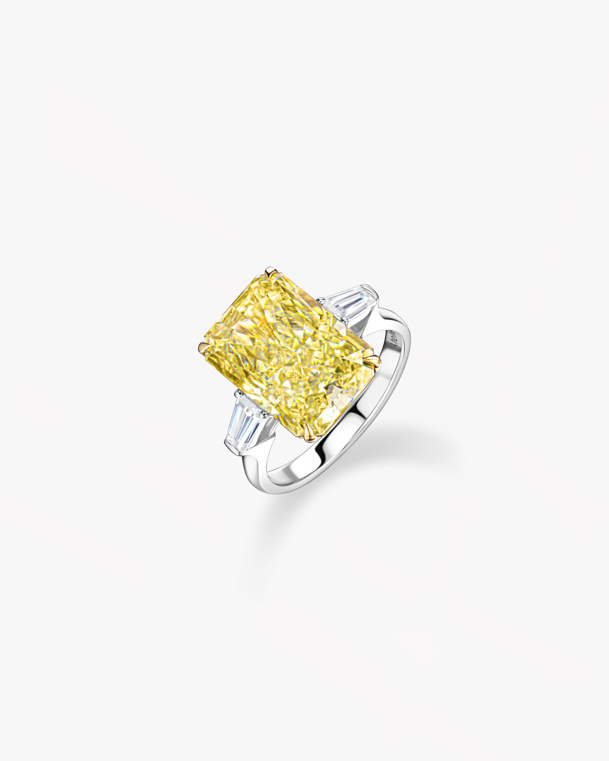 Вставка: муассанит огранка радиант Fancy Yellow 8.25 карата, трапеция 0,47 карата, суммарный вес камней 8,72 карата